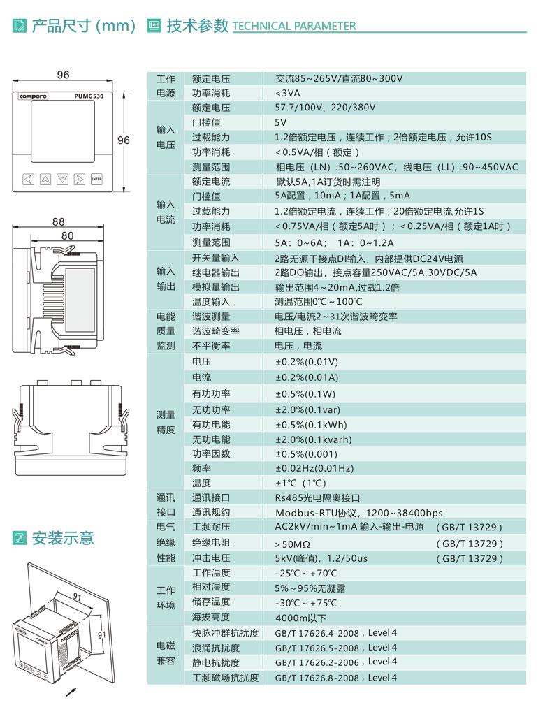 PUMG530系列三相智能電力儀表具有精確的電力參數(shù)測量功能,儀表采用先進的ARM處理器和數(shù)字信號處理技術設計而成;集三相電參量測量、顯示、電能統(tǒng)計、電能質(zhì)量分析、數(shù)字輸入/輸出及網(wǎng)絡通訊于一體;具有精度高、隔離性強、性能穩(wěn)定、抗干擾能力強等優(yōu)點。該儀表還有很強的擴展功能,如監(jiān)視外部開關動作、4~20mA模擬量輸出,還可以通過RS-485通訊實現(xiàn)儀表的網(wǎng)絡化管理。