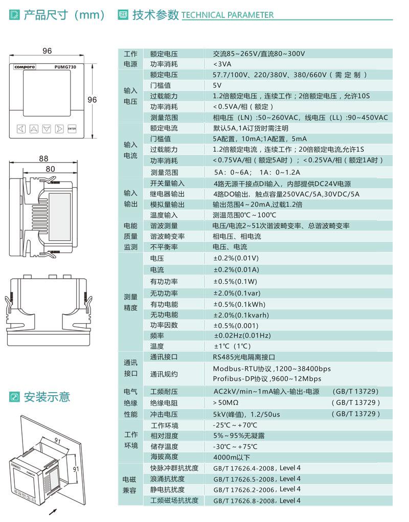 PUMG730系列多功能儀表具有精確的電力參數測量,雙向四象限電能計量、統計、記錄等功能。采用先進的ARM處理器和數字信號處理技術設計而成。