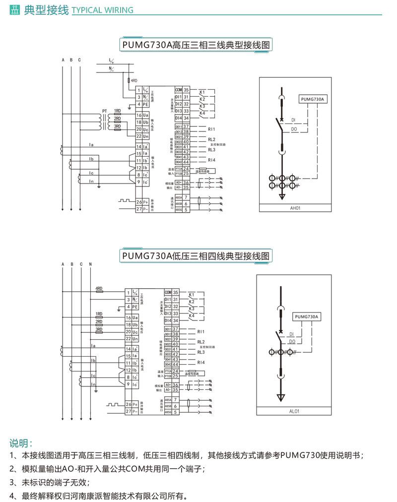 下圖為PUMG730多功能儀表典型接線圖示意圖,各型號具體接線方式以說明書或樣本為準。