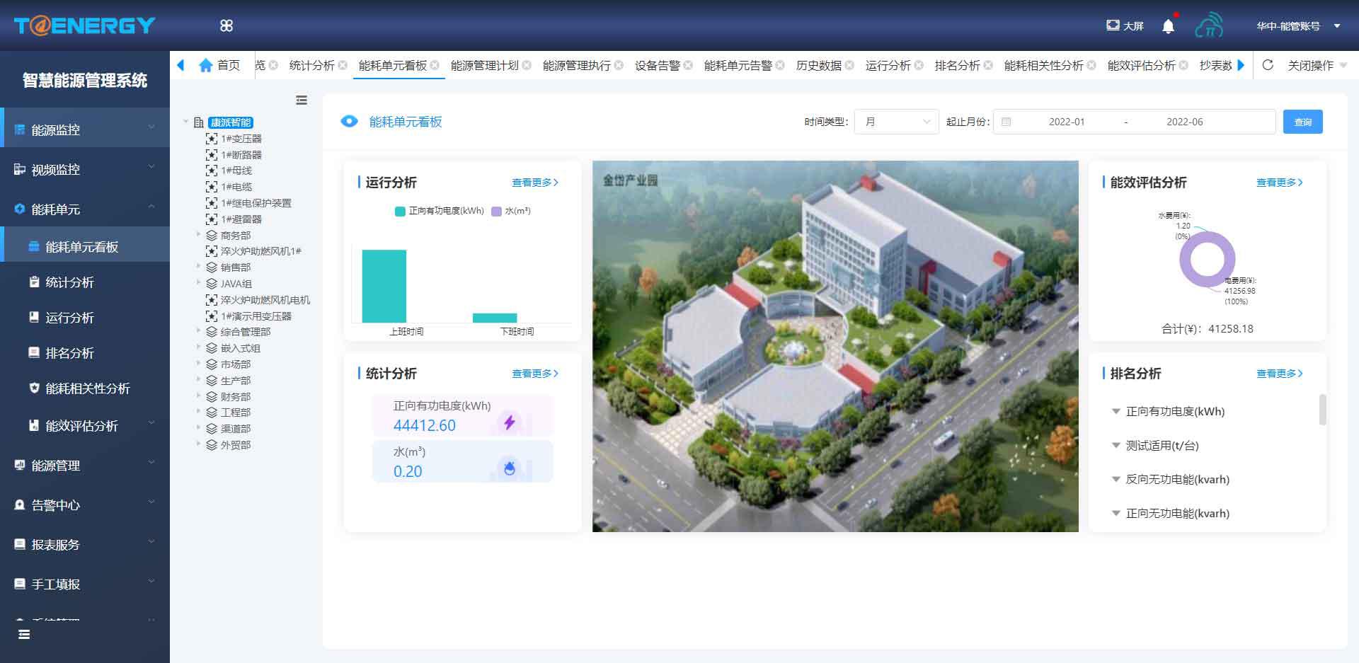 T@Energy智慧能源管理系統(tǒng)對能源使用情況,對設(shè)備運(yùn)行實行集中監(jiān)測、管理和分散控制。以區(qū)域數(shù)據(jù)為基礎(chǔ),結(jié)合“互聯(lián)網(wǎng)+大數(shù)據(jù)”的有效利用,自由組合成多個“能耗單元”,通過智慧能源綜合管理平臺的實現(xiàn)能碳管理、能耗分析、單耗指標(biāo)、專家評估、智能預(yù)測等。主要側(cè)重于對水、電、氣、暖的用能分析。大屏展示: