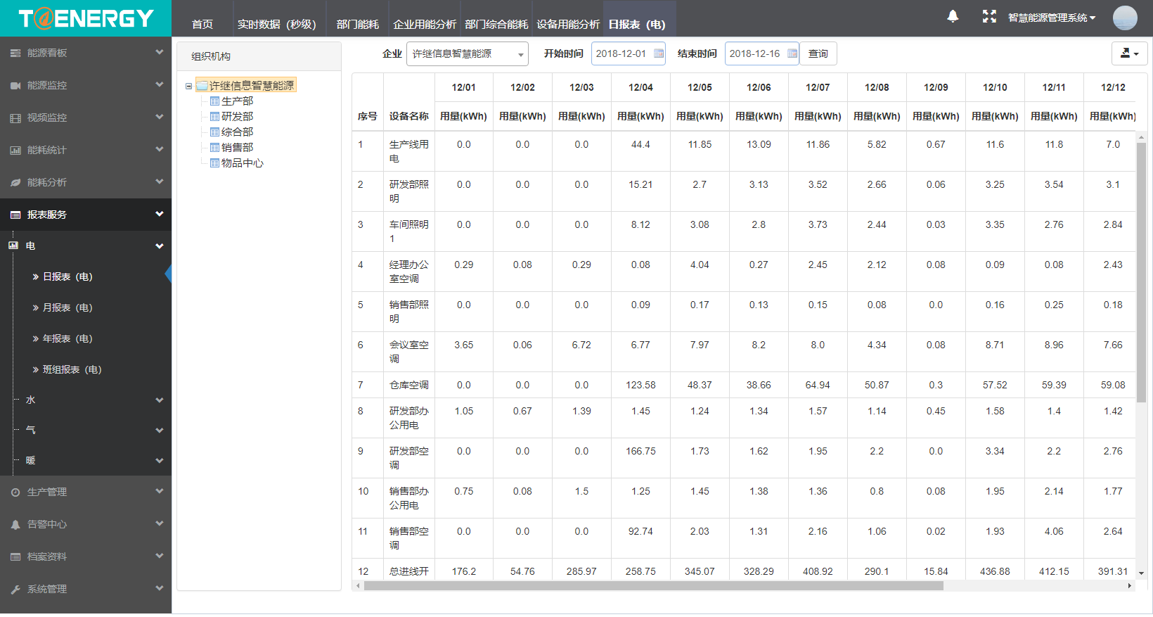 2.對各能耗設備的能耗數據進行統計分析與展現;并對用能趨勢進行分析。