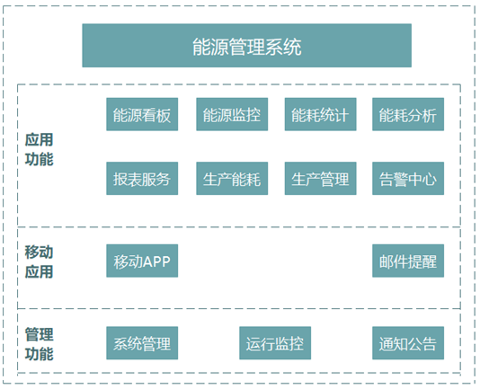 能源管理系統是一個能源管理工具及方案的統稱,它的表征是操作系統軟件,實際上是一個整體能源管理方案的集合體現。因此,不同的廠家對于能源管理系統的解讀是不同的,但能源管理系統的應用功能上是集中于應用功能、移動應用、管理功能三大模塊。