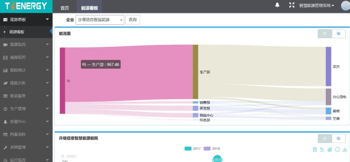 對企業、部門、設備的用能進行分析,發現能耗的異常點;并對電量電費、負荷特性、電價時段、功率因數進行統計分析展現。