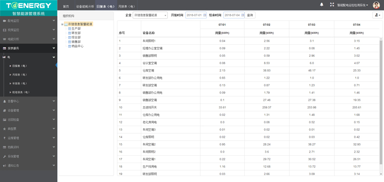 能耗分析包括企業用能分析、部門綜合能耗、設備用能分析和電量指標綜合分析這四類,將企業中各部門及各監測點實際用能情況,通過不同的分析方式展現出來。