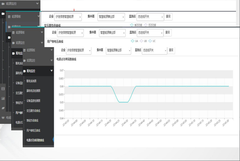 實(shí)時(shí)數(shù)據(jù)監(jiān)測:(電流、電壓、功率、功率因數(shù)、開關(guān)量)支持多曲線呈現(xiàn),秒級/分鐘級/信號