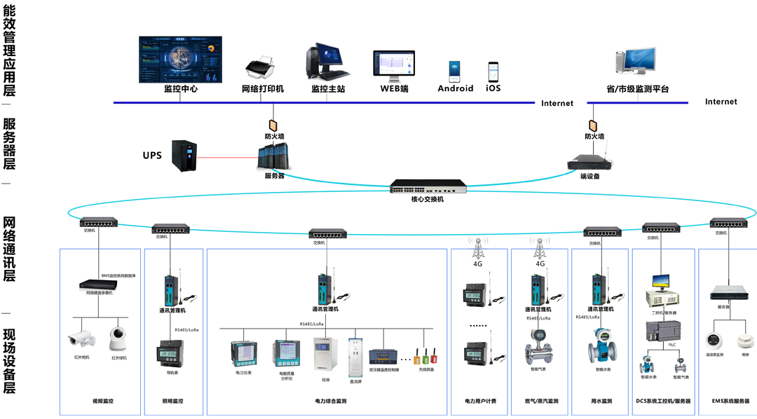 T@Energy智慧管理能源系統基于B/S構建,包括能效管理層、網絡通訊層、現場設備層。如下圖所示
