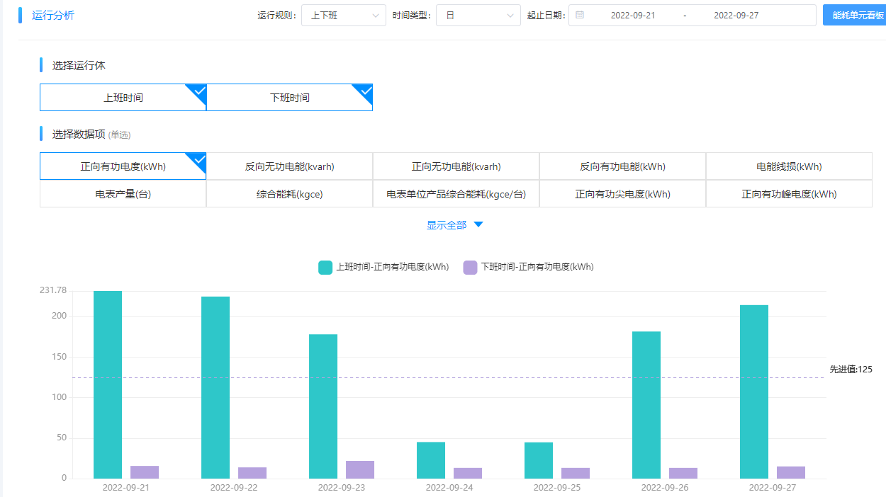 觀察數據變化。在“能耗單元-運行分析”模塊選擇日數據觀察近一周數據變化: