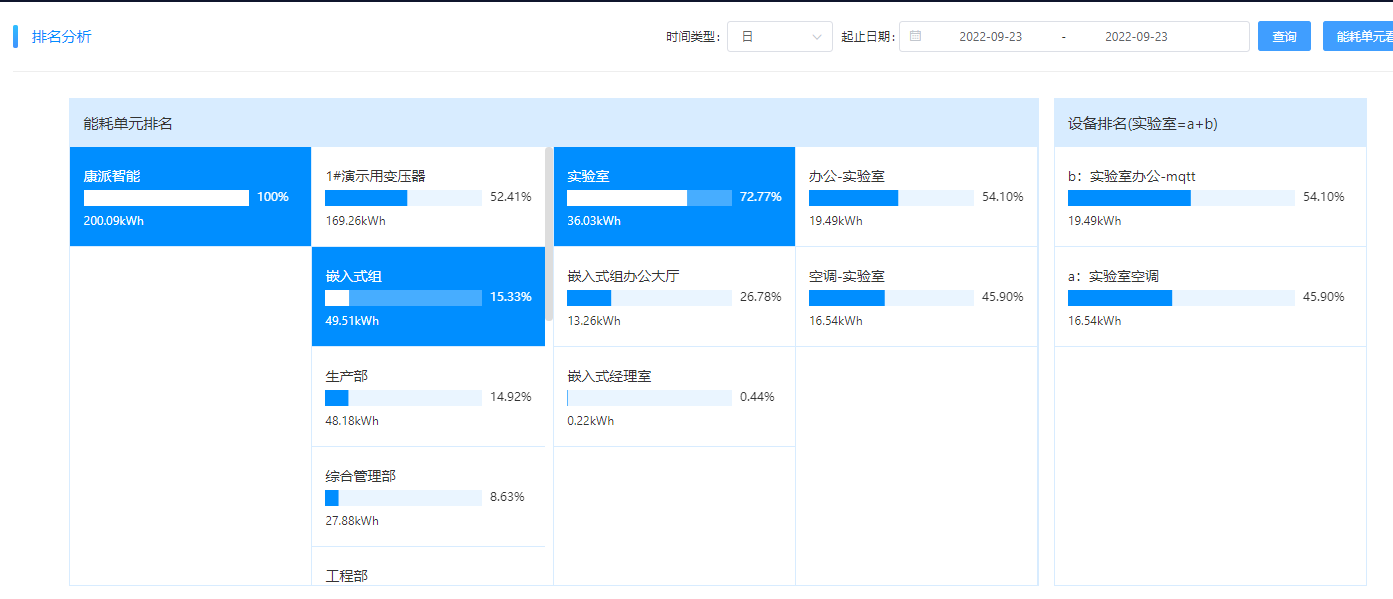 沿途索驥。通過前后兩天的能耗排名變化,確定異常用能部門。嵌入式組的用電排名,22號在第4位,23號升到第二位,多出了5kWh左右。通過對嵌入式組下一級的能耗對比發現為實驗室用能比前一天多了6kWh左右,再進一步對實驗室的下一級能耗分析,發現為實驗室空調比前一日多了6kWh。可以初步確認是實驗室的空調在非工作時間沒有關機。