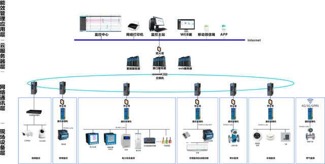 架構設計主要以數據采集系統和數據應用系統為核心,搭建能源綜合管理平臺,從架構上主要分為現場設備層、網絡通訊層、服務器層、能效管理應用層4個部分。