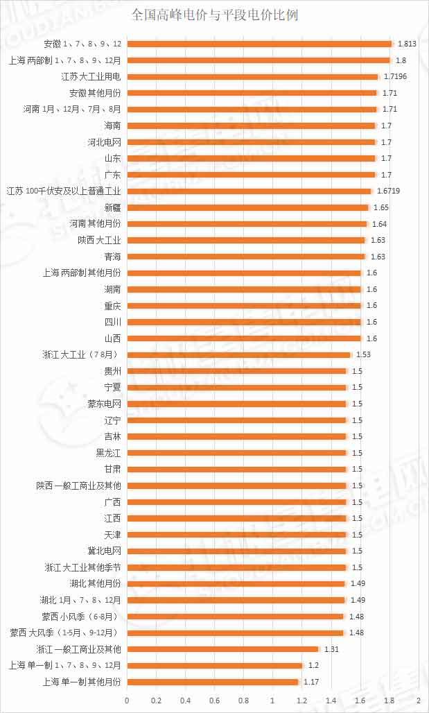 尖峰電價:總體來看,絕大部分地區的尖峰電價是在高峰電價的基礎上上浮20%,部分地區,如廣東、上海、遼寧的尖峰電價是在高峰電價的基礎上上浮25%。山東、湖北尖峰電價均是以平段電價為基礎進行上浮。其中山東尖峰電價上浮100%,即為平段電價的2倍,湖北1、7、8、12月的尖峰電價浮動比例為2,其他月份尖峰電價浮動比例仍按原來的1.8執行。安徽尖峰電價是在當日高峰時段電價基礎上每千瓦時上浮0.072元。
