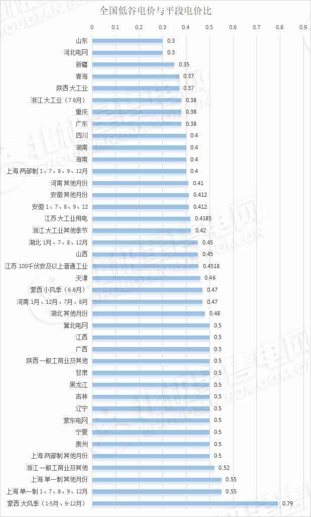 低谷電價:全國來看,低谷電價與平段電價的比例在0.3-0.79之間(即低谷電價較平段下浮21%-70%之間)。其中山東和河北電網的下浮比例最大,達到70%,山東還設置深谷電價,深谷電價下降90%。蒙西大風季(1-5月、9-12月)谷電價格下浮比例最小,在平段價格的基礎上下浮21%,小風季下浮53%。冀北電網、江西、廣西、陜西(農業/一般工商業及其他用電)、甘肅、黑龍江、吉林、遼寧、蒙東、寧夏、貴州和上海一般工商業及其他兩部制、大工業兩部制其他月份用電的谷段電價均下浮50%。
