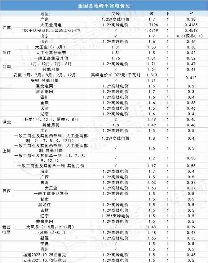 全國各地分時電價-峰谷電價的浮動情況