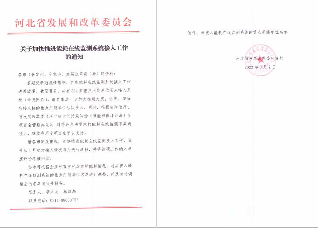 日前,河北省發改革委會下發紅頭文件,要求未接入能耗在線監測系統的重點用能單位請盡快接入,具體文件內容如下: