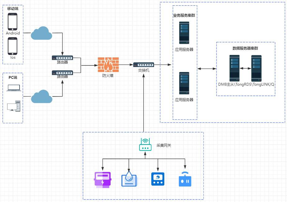 多端(PC、移動端)通過局域網路由器和交換機等網絡設備訪問服務器,服務器及時響應數據,應用服務器和數據服務器采用2個節點的高可用部署。