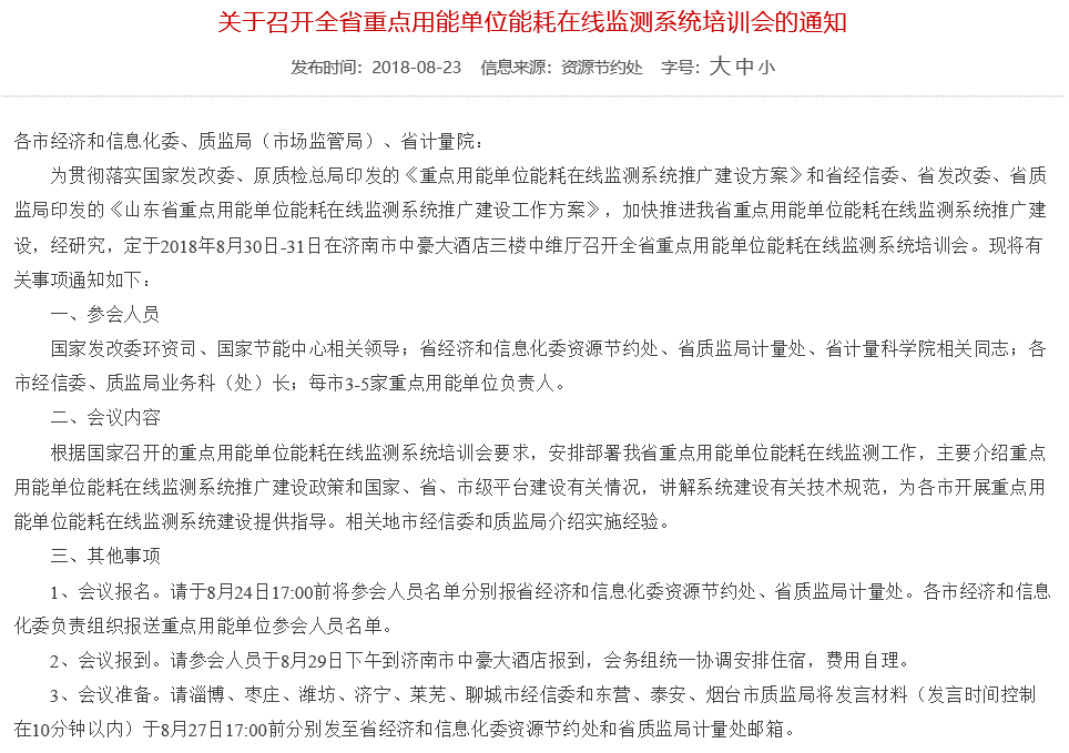 《山東省重點用能單位能耗在線監測系統培訓會》通知如下: