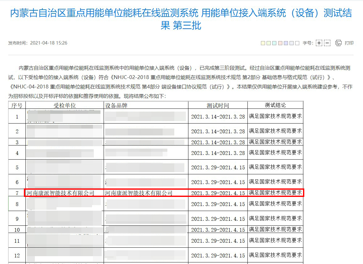 2021年4月18日,內蒙古自治區重點用能單位能耗在線監測系統中的用能單位接入端系統(設備),已通過第三階段測評。經過內蒙古自治區計量測試研究院測評,康派智能能耗在線監測端設備符合內蒙古自治區重點用能單位能耗在線監測系統技術要求。公布結果如下圖所示: