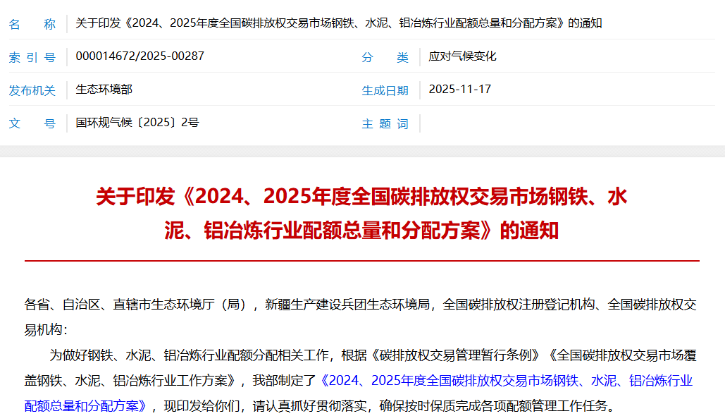 為加快建成更加有效、更有活力、更具國際影響力的碳市場,助力實(shí)現(xiàn)碳達(dá)峰碳中和目標(biāo),生態(tài)環(huán)境部于近日出臺(tái)《2024、2025年度全國碳排放權(quán)交易市場鋼鐵、水泥、鋁冶煉行業(yè)配額總量和分配方案》,對(duì)2024、2025年度配額分配范圍和方法、配額發(fā)放、配額清繳、配額結(jié)轉(zhuǎn)等各項(xiàng)工作進(jìn)行了安排部署。